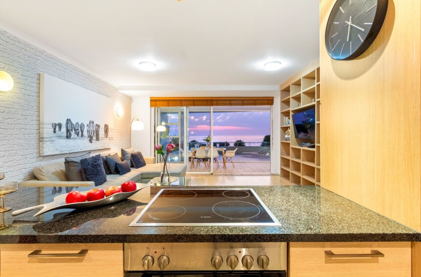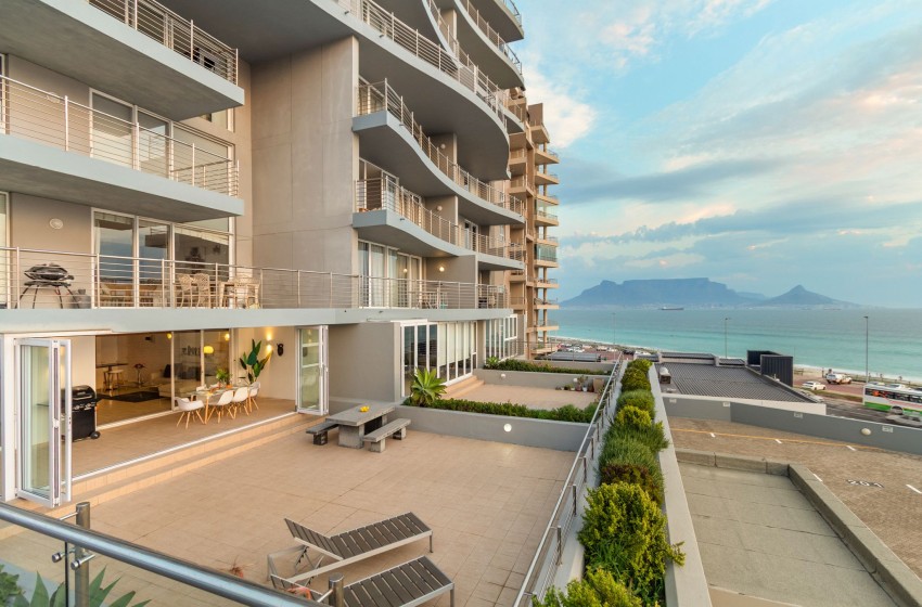 The main living area has a rustic elegance thanks to the large white face brick wall lining one side. The apartment has an open-plan fully-equipped kitchen and spacious lounge in soothing natural tones with a flat-screen TV and DSTV. The main living area leads to a sun lounge with a 4-seater dining table. Glass stacking doors that open fully lead onto the large private balcony with loungers, a casual dining area and exceptional ocean views - perfect for entertaining or simply enjoying a Cape Town sunset.