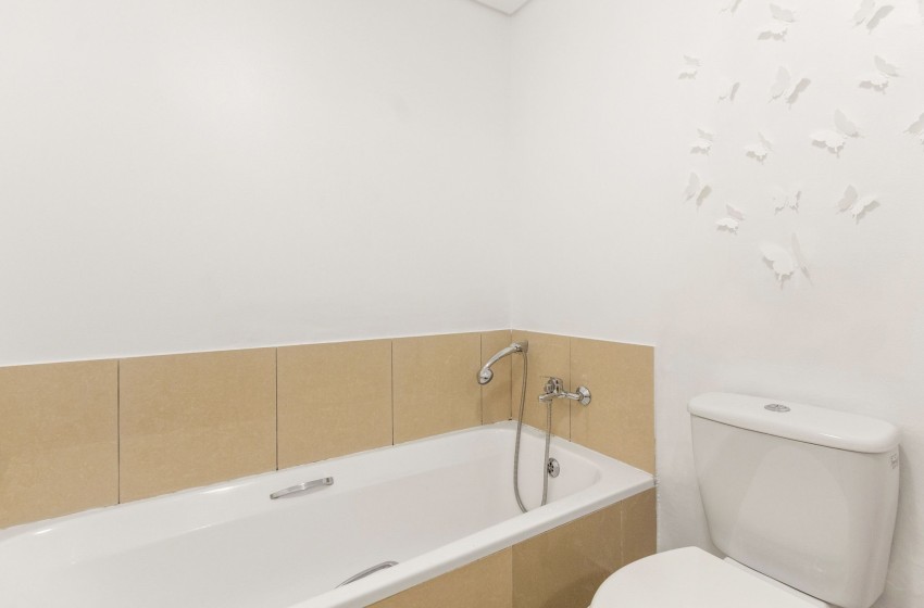 The main bedroom has a double bed, an en-suite bathroom with a bathtub, and balcony access. The second bedroom has a double bed and access to the shared bathroom featuring a shower. Additional amenities of the apartment include WiFi, barbecue facilities, a swimming pool, secure parking in a bay, and 24-hour security.