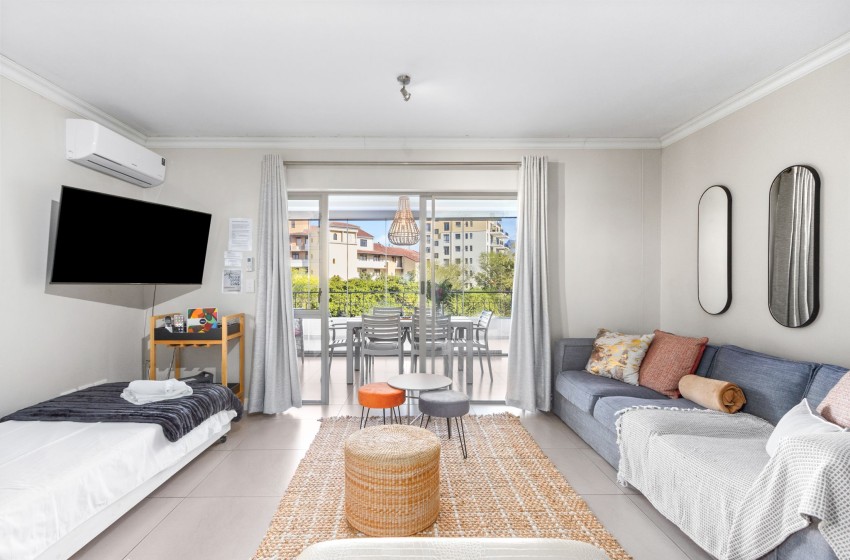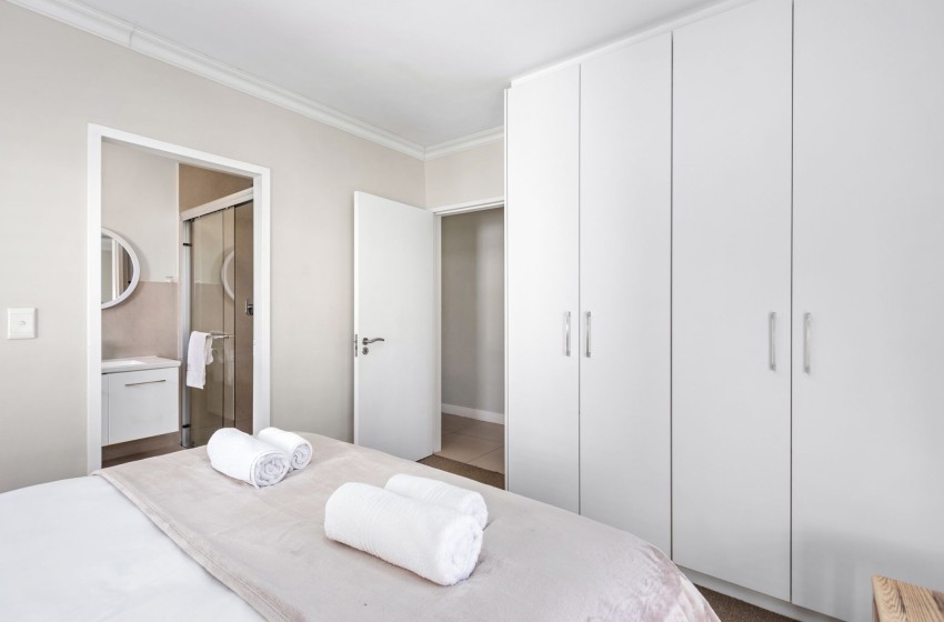 Welcome to Mayfair 246, a charming apartment nestled in the heart of Century City where the view of Table Mountain peaks through the trees. Perfectly suited for a family or a small group, this one-bedroom apartment offers a queen bed and a single bed, comfortably accommodating up to three guests. The ensuite bathroom features a modern shower and toilet.