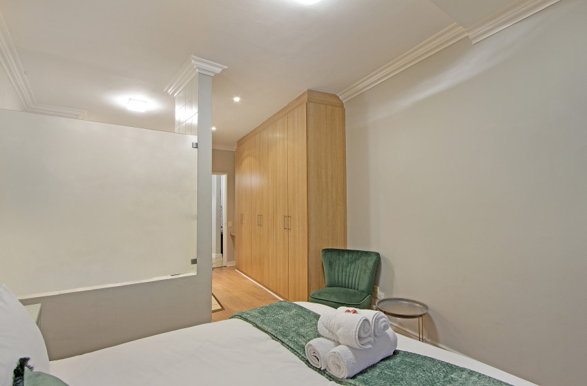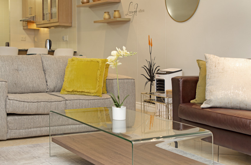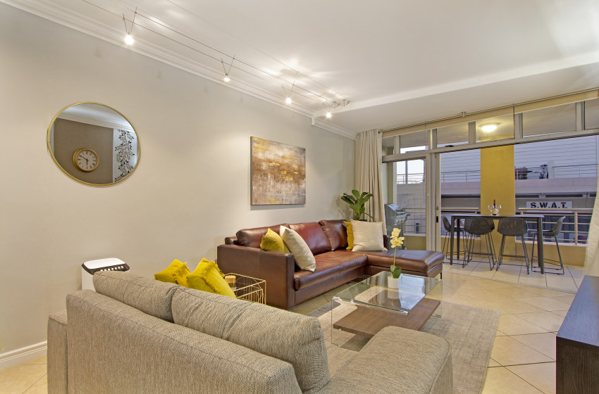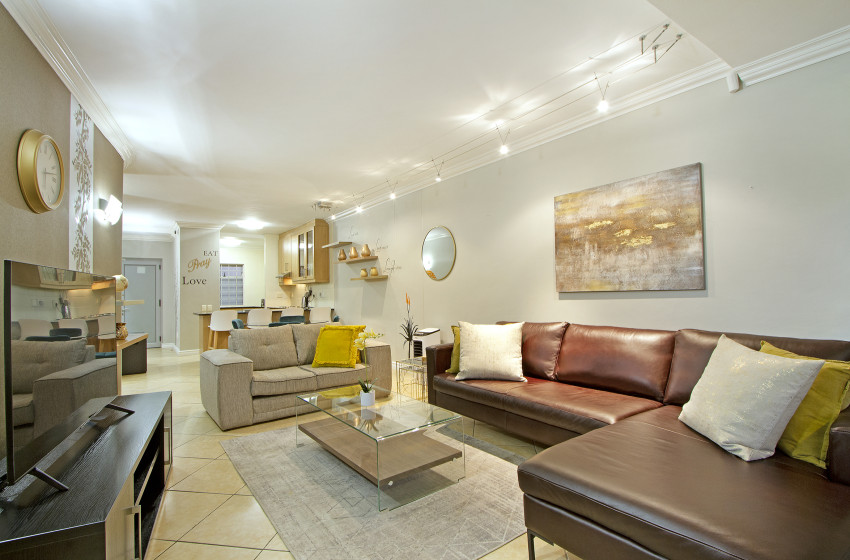 The apartment has an open-plan design, featuring a fully equipped kitchen for easy self-catering, a cosy 4-seater dining table, and a lounge styled in neutral tones and brown leather offset with bright accents for a stunning space that encourages rest and relaxation. The lounge has a large flat-screen TV and leads to a large balcony with a gas braai and seating for 6.