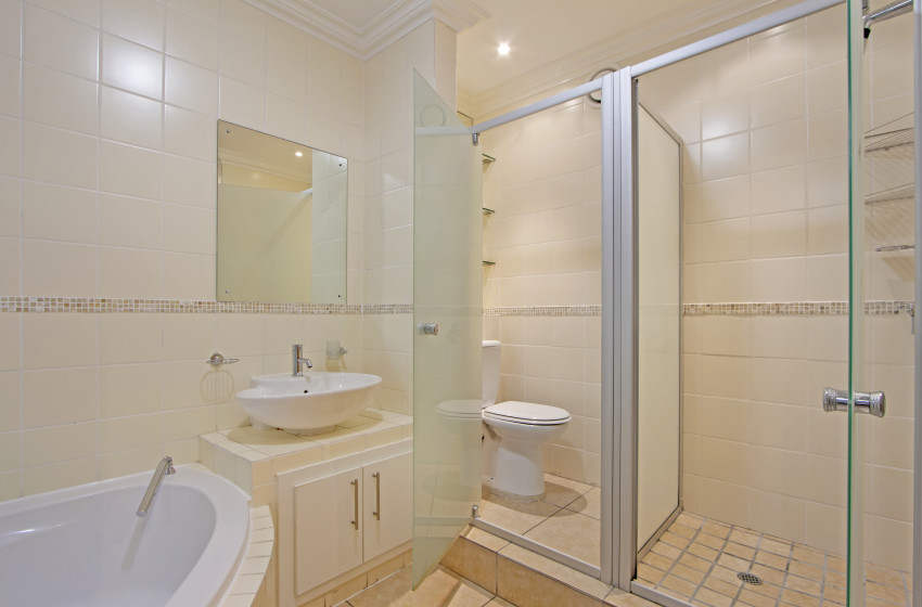 The apartment has 2 bedrooms and can accommodate up to 5 guests. The main bedroom boasts a queen bed, balcony access, and an en-suite bathroom featuring a bathtub and shower. The second bedroom has a bunk bed with a double bed on the bottom and a single bed on top, accessing the shared bathroom featuring a shower.