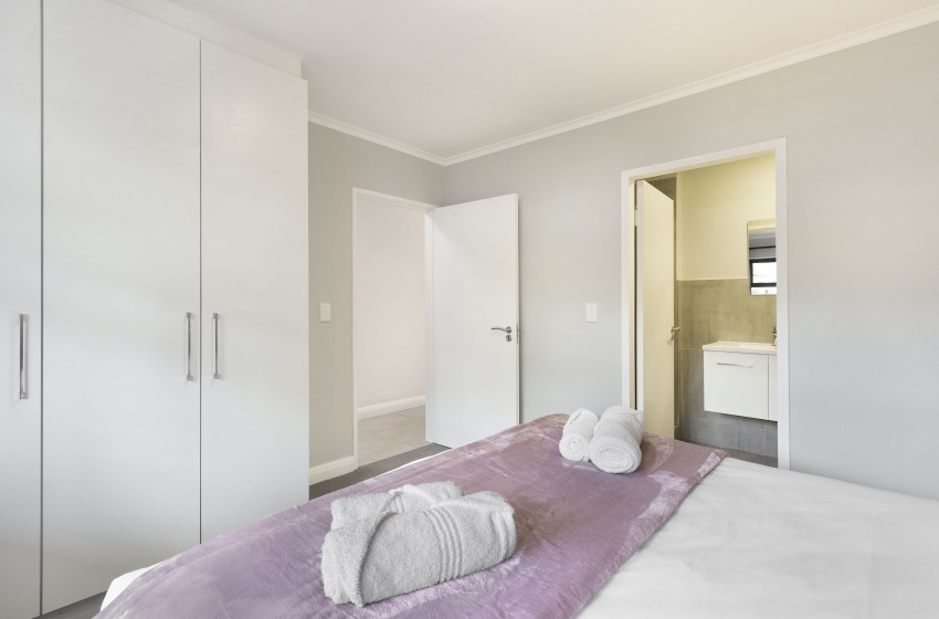 The apartment features an open plan design of the living space which includes a fully equipped kitchen with a dishwasher and washing machine for your convenience, a dining area seating 4 guests and a cozy lounge fitted with a flat-screen TV. Leading out from the living space is a gorgeous patio/garden area with outside furniture where you can sit and enjoy the serenity of the outdoors. The apartment is in a secure complex with remote control access and provides access to a swimming pool as well as braai facilities. The stylish bedroom in this unit offers a comfy queen size bed with fresh linen. The immaculate bathroom includes a shower, toilet, basin and clean towels.