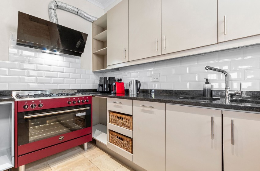 As you enter, you’ll be welcomed by a warm and stylish living space. The fully equipped kitchen features everything you need for a comfortable self-catering stay including a large stove oven, Nespresso machine, air fryer, dishwasher, washing machine, and tumble dryer. A charming serving hatch connects the kitchen and dining room, making it easy to share meals and conversation during intimate dinners. The dining area, accessible through a graceful arched entryway, features a large table with seating for up to six guests.