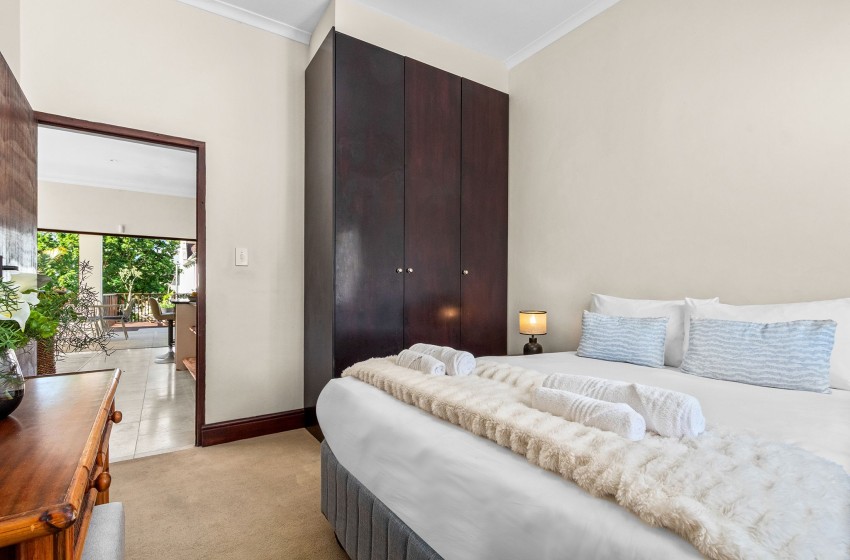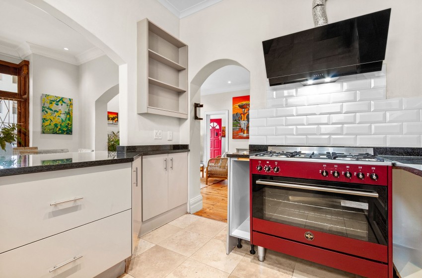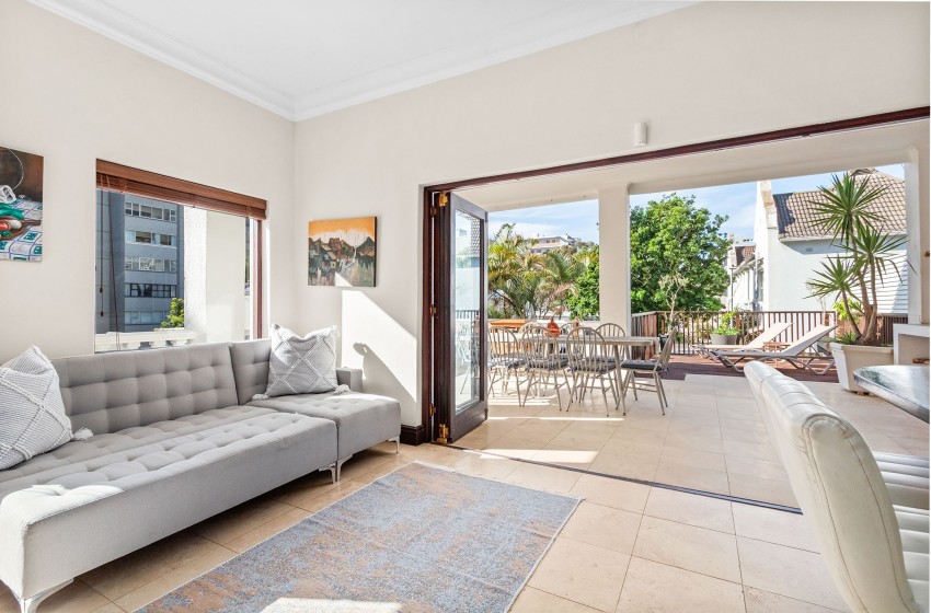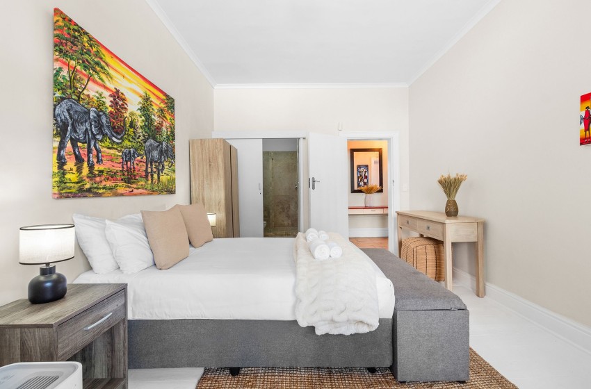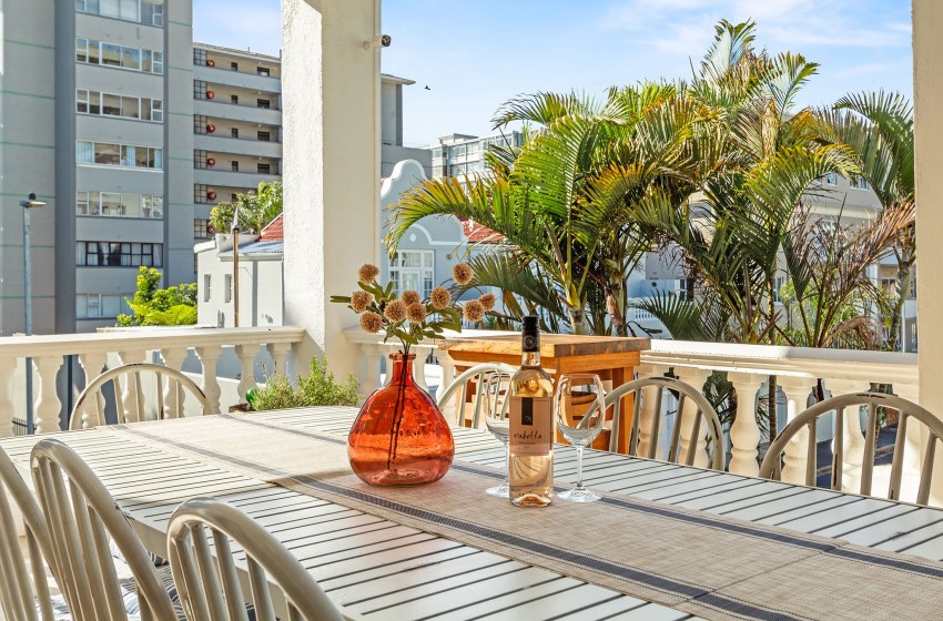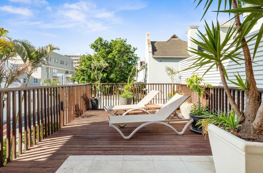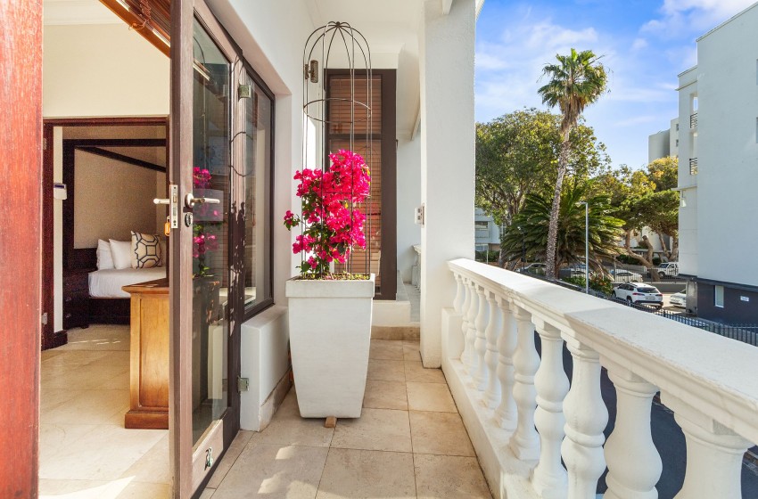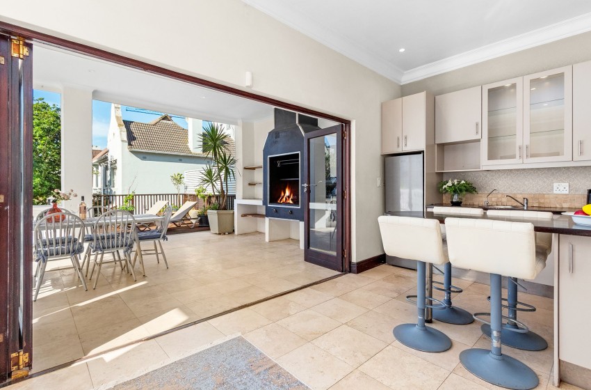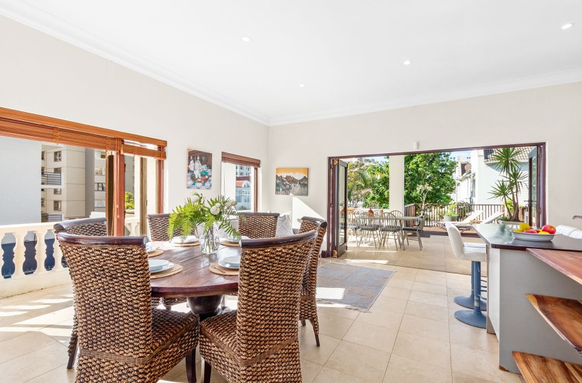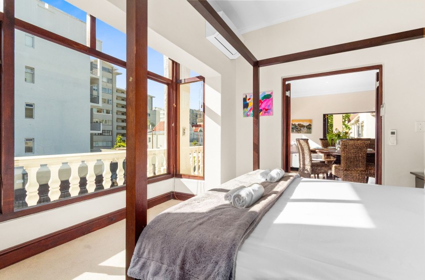 Upstairs, guests will find two bedrooms and two bathrooms, while the third bedroom and an additional bathroom are located downstairs. The main bedroom features a king-sized bed, air conditioning, and access to a beautiful private balcony complete with an outdoor dining table for eight, a braai area, and breathtaking views overlooking the historical buildings of Sea Point.