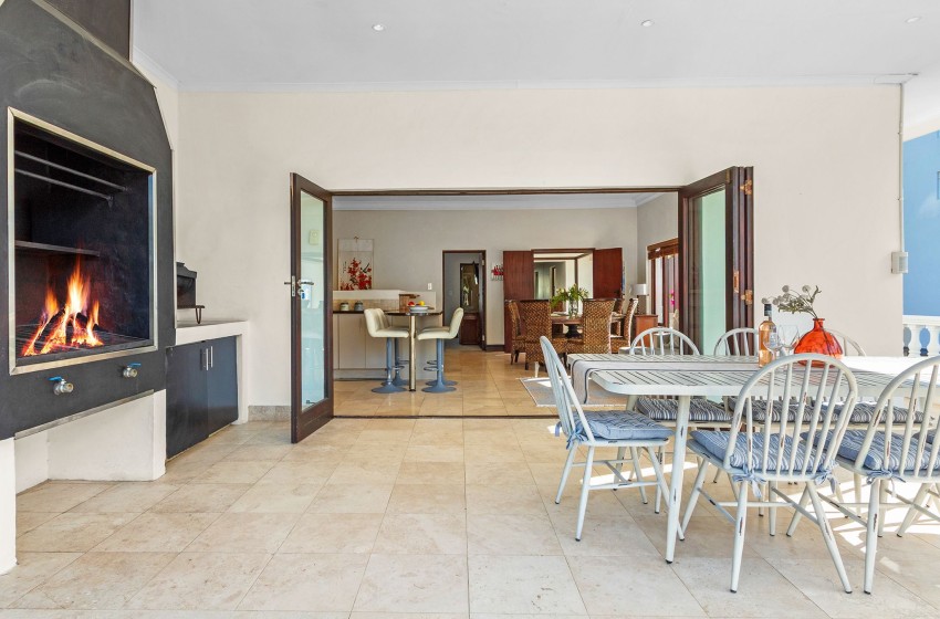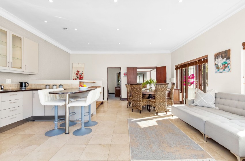 The living room offers a cosy yet elegant setting with a woven sofa and armchairs, a flat-screen TV, and Wi-Fi throughout the property. The home is load-shedding friendly, supported by a large generator to keep the lights and internet running without interruption.