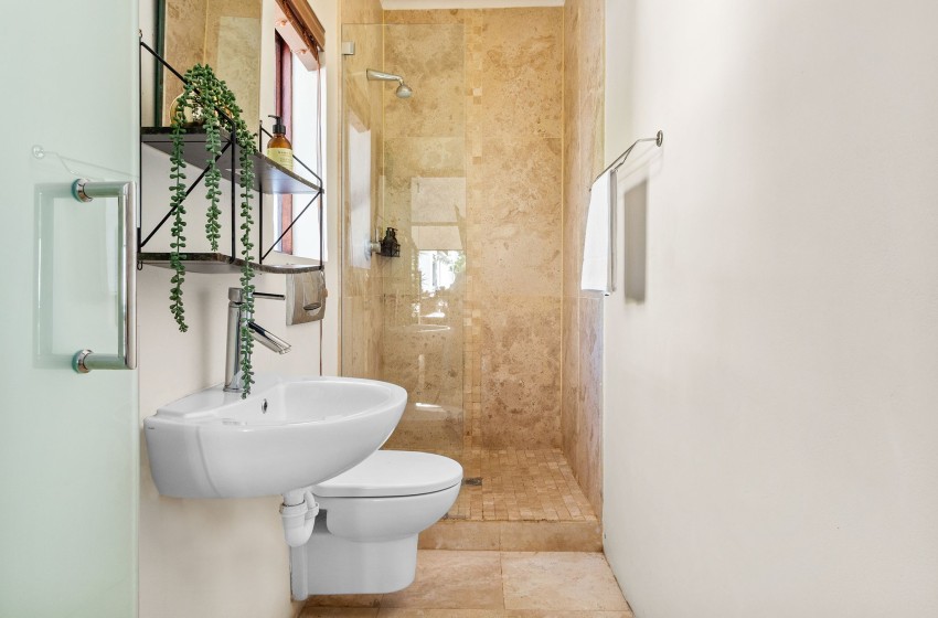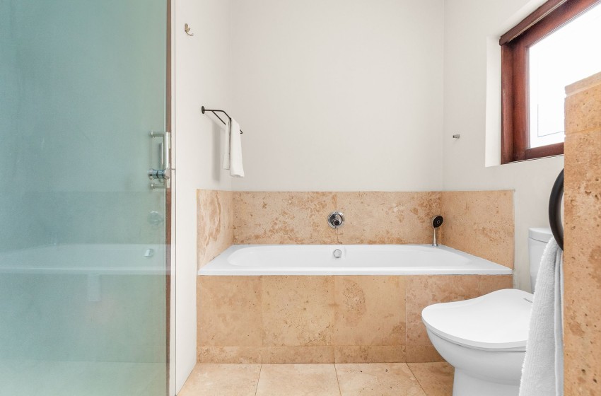The second bedroom includes a double bed, television, and easy access to the remaining bathroom, which includes a bathtub. The third bedroom offers a double bed and an en-suite bathroom with a shower, vanity, and toilet, along with French doors that open directly to the garden and plunge pool area. Fresh linen and towels are provided for your convenience.