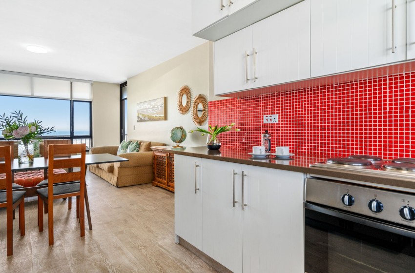 Imagine waking up every morning to the music of crashing waves as you ease into the day by enjoying a cup of coffee on your balcony overlooking the beach - yes, please! This apartment is quite large, offering spacious living areas and comfortable furnishings. The main living area is open plan with an easy flow from the fully equipped kitchen to the lounge, complete with a wall-length floor to ceiling window, a flat-screen TV and access to the balcony.